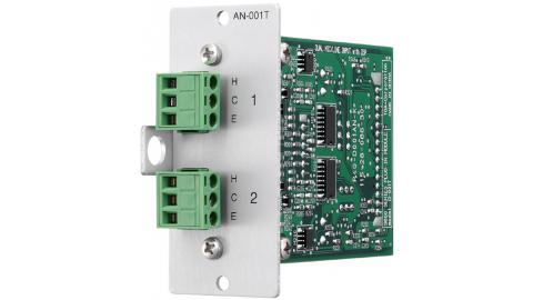 AN-001T là mô đun cắm của bộ phận phát hiện tiếng ồn 2 kênh và được thiết kế riêng cho tăng âm dòng 9000. Thiết bị sẽ tự động điều chỉnh âm lượng ngõ ra tương ứng với độ ồn môi trường. AN-001T có thể xử lý tín hiệu đầu vào từ mức micro (-60 dB) tới mức line (-10 dB) bằng quy trình điều khiển 9 bước. Có nguồn phantom (+24 V) khi sử dụng micro điện dung.
